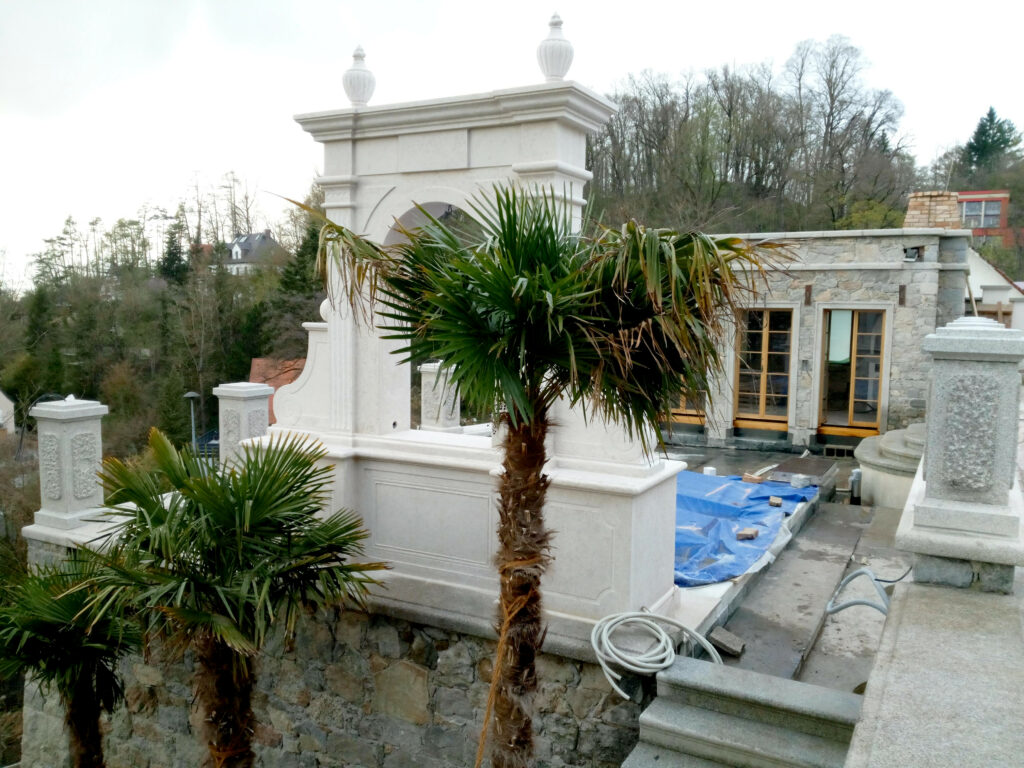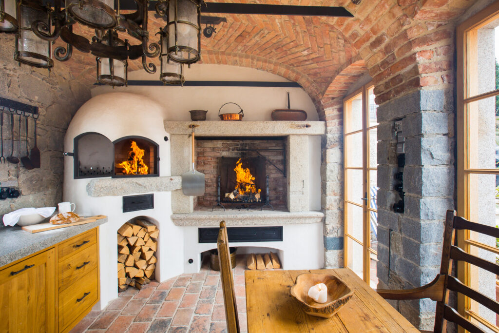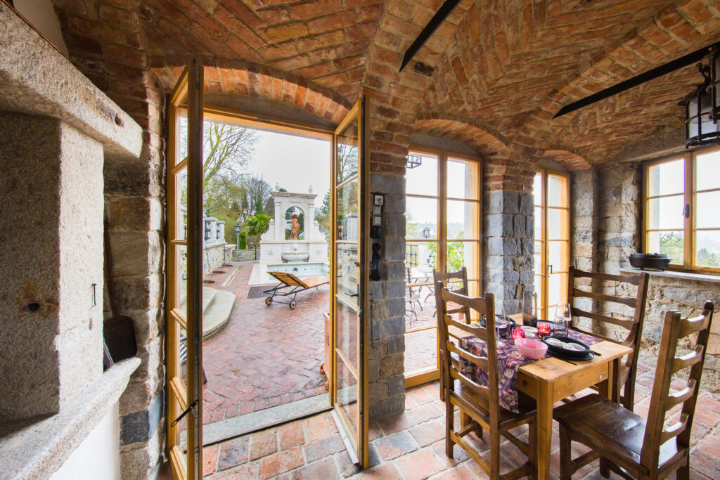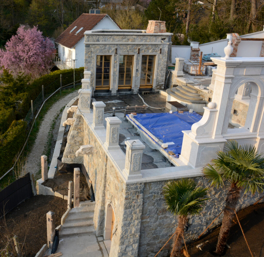 Poolhaus mit Natursteinfassade und gewölbter Outdoor-Küche.