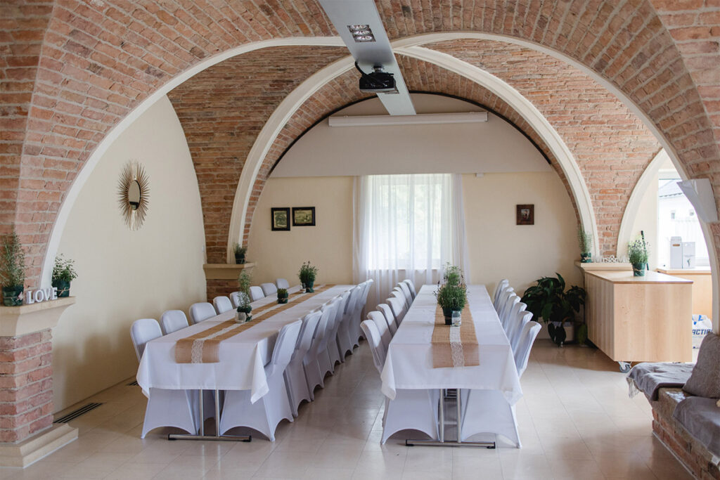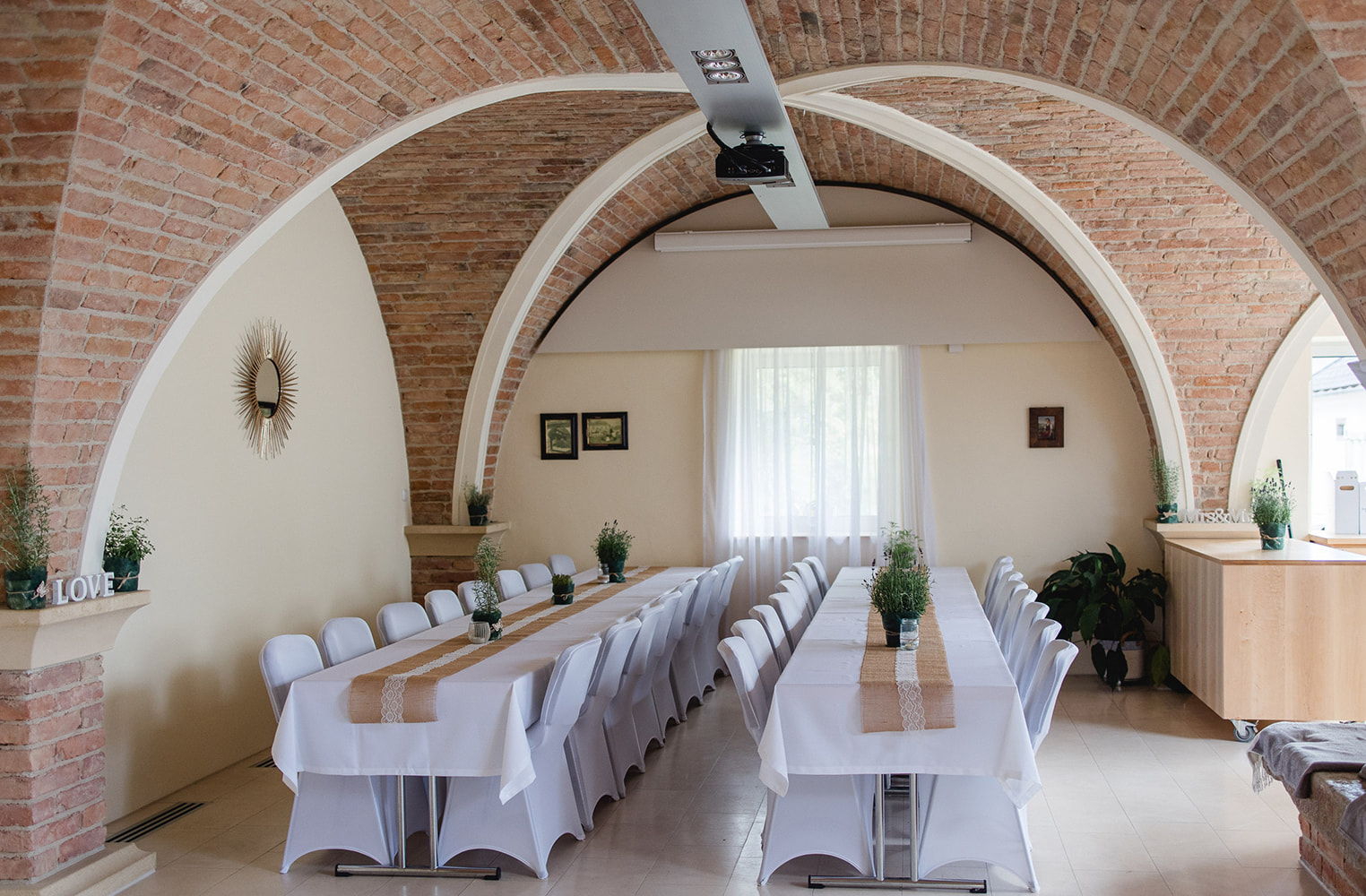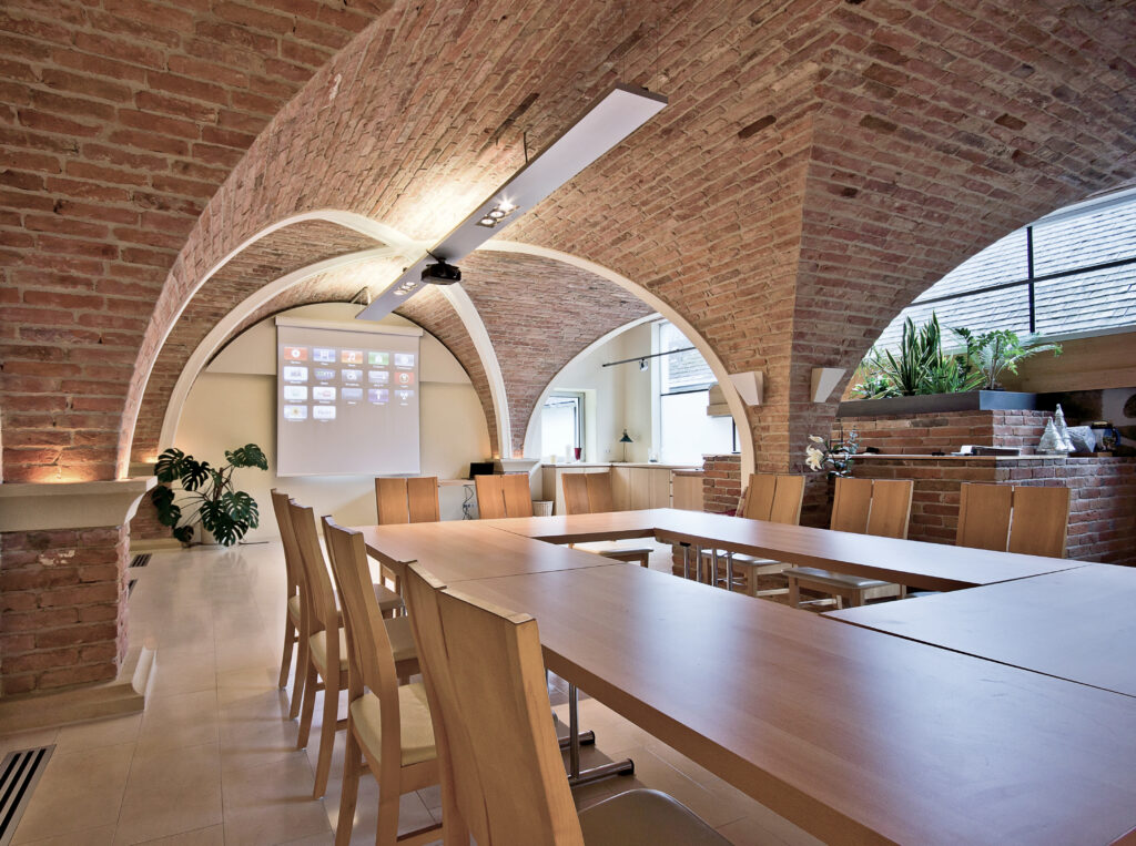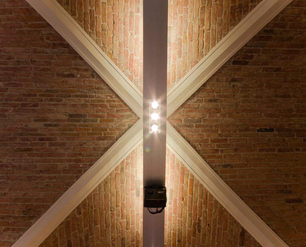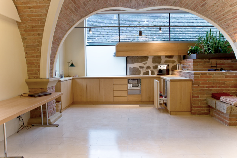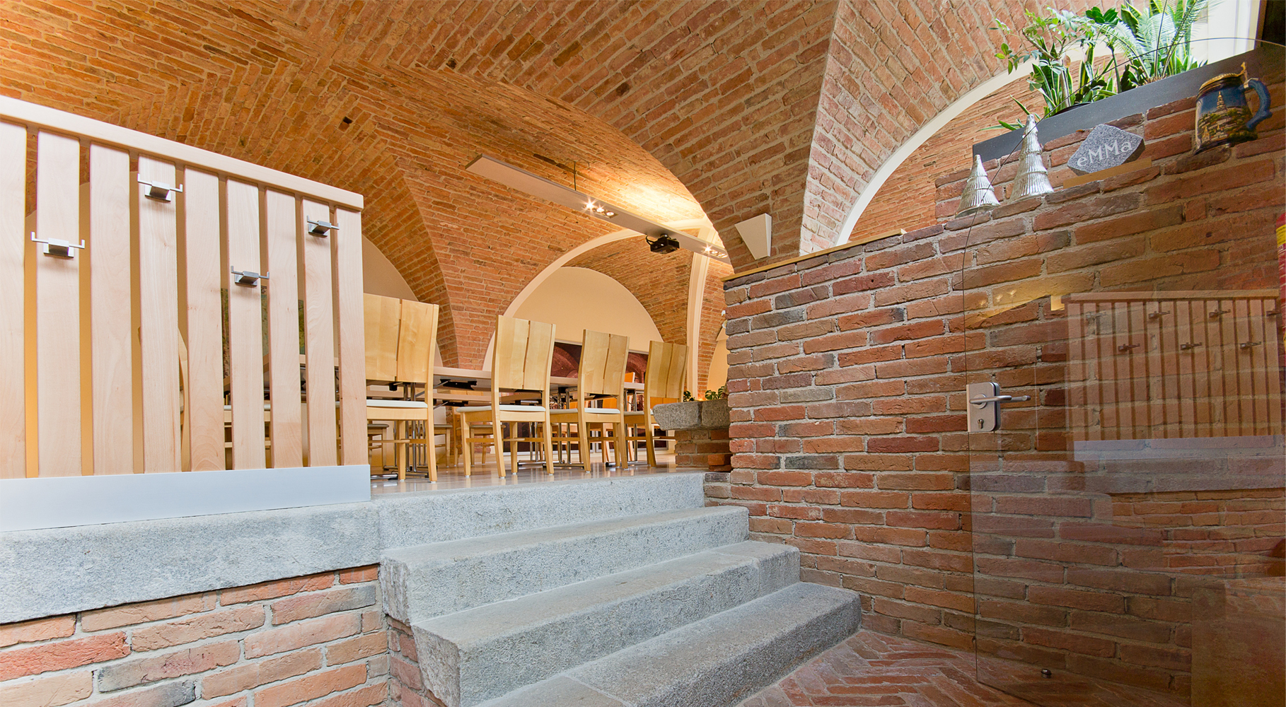 Kreuzgewölbe aus antiken Ziegeln. Lichtdurchflutet durch viel Glas.