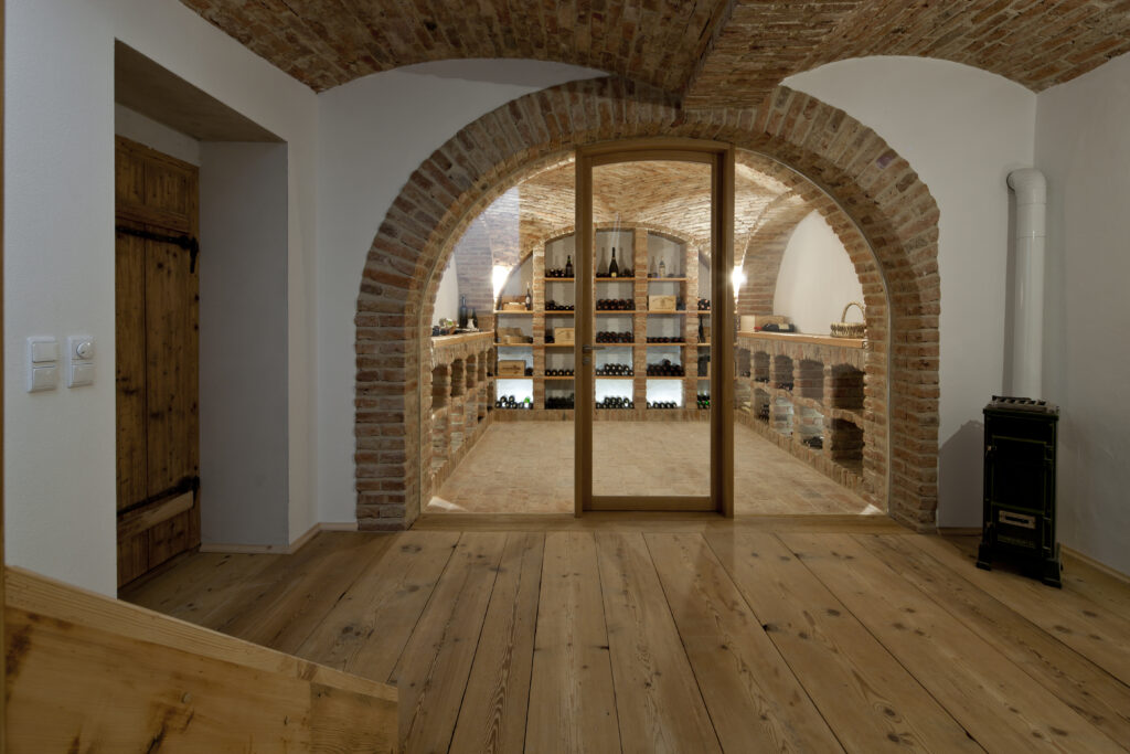 Weinkeller mit thermischer Trennung und Rundbogen. Böhmisches Platzlgewölbe gemauert mit antiken Ziegeln in Sichtausführung. Weinlagerkonzept mit Weinregalen.